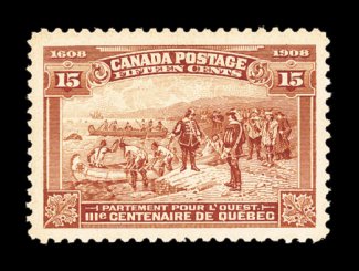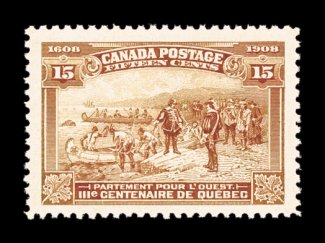 830 nh 102 image #102, 1908 15c Quebec Tercentenary, striking mint single, wonderfully well centered within incredibly large margins and surrounded by full even perforations, warm rich color, unblemished o.g., n.h., extremely fine; actually a very difficult stamp to find in this gem never hinged condition; 2000 PF certificate (Unitrade C$750.00). (Image) $375.00