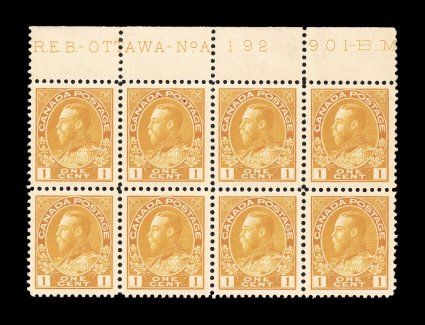 834 og/nhPB 105d image#105, 1c Orange yellow, dry printing, Die II, top margin inscription and plate no. A-192 block of eight, marvelously fresh with brilliant color, exceptionally well centered overall and particularly the bottom row stamps, o.g., lightly hinged in the selvage, stamps are all never hinged, an extremely fine and scarce plate block; ex-Lussey. (Image) Est. 300-400