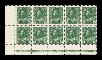 837 og/nhbl 107 image#107, 2c Yellow green, wet printing, bottom left corner margin block of 10 with 40% of lathework Ty. D inverted, an attractive block with overall exceptional centering, bright strong color, fresh o.g., five stamps lightly hinged and five stamps never hinged, all but one in the bottom row, very fine-extremely fine position piece; ex-Lussey. (Image) Est. 500-750