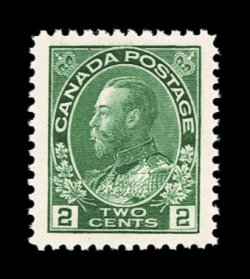 841 nh Unitrade #107ii imageUnitrade # 107ii, 2c Green, wet printing, marvelously well centered mint single possessing exceptionally wide even margins, vibrant bright color on fresh white paper exhibiting full even perforations, immaculate o.g., n.h., extremely fine jumbo; not at all common in this gem condition (Scott for normal yellow green color $27.50). (Image) Unitrade C$45.00