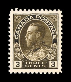 849 nh 110 image#110, 4c Olive Bister, an eye-catching mint single, possessing extraordinarily large and wonderfully well balanced margins all around, flawlessly centered within these lavish borders, plus its color is rich and luxuriant, sharp detailed impression, pristine o.g., n.h., extremely fine; a true gem example (Unitrade C$195.00). (Image) $105.00