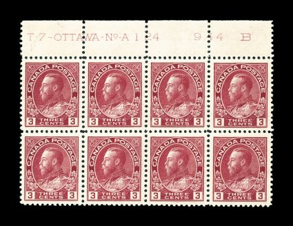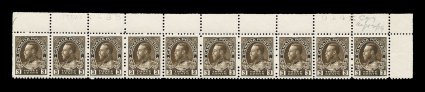 843 nh 108 image#108, 3c Brown, wet printing, top sheet-margin strip of ten being the entire top row with "Ottawa No. A 36" inscription and plate number at left and "944K " at right, noted in pencil "Aug. 12/19" date, exceptionally fresh with deep color, unusually well centered for a multiple of this size with a number of gem singles, o.g., n.h., very fine-extremely fine; catalog values for singles (Unitrade C$750.00+). (Image) $400.00+