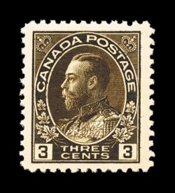 844 nh 108c image#108c, 3c Brown, dry printing, a most impressive mint single, being exceedingly well centered within uncommonly large margins, deep luxuriant color and an especially intense impression, unblemished o.g., n.h., extremely fine (Unitrade C$75.00). (Image) $32.50
