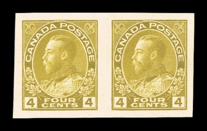 850 og 110a image#110a, 4c Olive Bister, imperforate, horizontal pair, exceptionally large and balanced margins all around, strong vibrant color, o.g., lightly hinged, an extremely fine example of this very scarce imperforate pair of which only 50 pairs were issued (Unitrade C$2,500.00). (Image) $1,600.00