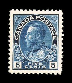 851 nh 111 image#111, 5c Dark blue, pristine mint single which possesses outstanding centering amid huge margins, rich luxuriant color and a crisp impression on bright paper, immaculate o.g., n.h., extremely fine; a striking example of this scarcer value (Unitrade C$600.00). (Image) $300.00