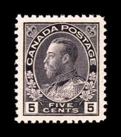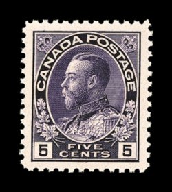 854 nh Unitrade #112i imageUnitrade #112i, 5c Gray violet, wet printing, select quality mint single of this shade variety, being exceptionally well centered within particularly large margins, deep color and a striking vivid impression, o.g., n.h., extremely fine (Scott for normal violet shade $65.00). (Image) Unitrade C$135.00