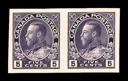 853 og 112b image#112b, 5c Violet, imperforate, exceptionally fresh horizontal pair, exceptionally rich color and sharp impression, beautifully balanced large margins all around, o.g., lightly hinged, extremely fine; a very rare pair with only 50 pairs issued (Unitrade C$2,500.00). (Image) $1,600.00
