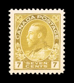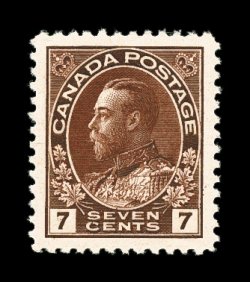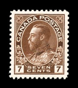 859 nh 114b image#114b, 7c Red brown, wet printing, gem mint single being "post office" fresh in an unusually rich shade on bright white paper, plus possessing outstanding centering within immense margins,, o.g., n.h., extremely fine jumbo (Unitrade C$105.00). (Image) $52.50