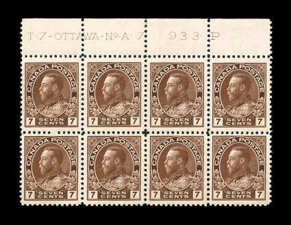 858 og/nhPB 114 image#114, 1924 7c Red brown, dry printing, remarkably handsome top sheet-margin imprint and plate no. A 7 block of eight, possessing beautiful bright color and detailed impression, exceptionally well centered especially for a multiple of this size, o.g., top strip n.h., bottom strip appears never hinged but has faint traces of disturbance, extremely fine and lovely plate block. (Image) Est. 300-400