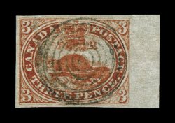 647 O Unitrade #4dvii imageUnitrade #4dvii, 3p Orange red thin paper, major re-entry, position 47, pane A, this is one of the most striking re-entries being most apparent with a line running through the top of the letters "ee Pence" of "Three Pence" plus numerous other lines showing in the inscriptions and the numeral "3"s doubled at bottom, this particular example is especially desirable possessing four lavish and well balanced margins, the color is bright and intense with an exceptionally strong detailed impression that shows the re-entry extraordinarily well, neat light black target cancel, extremely fine; a rare and beautiful example of this variety; 2002 Greene Foundation certificate. (Image) Unitrade C$500.00