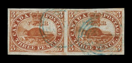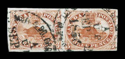 651 O Unitrade #4ii, 4xiii imageUnitrade #4ii, 4xiii, 3p Orange red on medium wove paper, major re-entry, position 80, pane A, phenomenal used pair (positions 79-80) possessing numerous desirable features that rarely are found in one piece, the color is distinctive being a pastel orange red on medium wove paper rather than the usual thin paper, also featuring a clear and detailed impression that shows the striking re-entry in the right stamp exceptionally well, wonderfully well margined with large to extraordinarily large margins all around, and in addition each stamp has a large portion of "Mon. & Br. Grd. Trk. R.W./Mail Cond'r/A/U P/Sep 2 1856" railroad cancel, extremely fine; this re-entry is extensive being very similar to position 47 with lines at the top of many letters in the inscription, as well as numerous additional lines throughout the design, very rare being listed by Unitrade for both #1 and #4 but having no price information for either; a showpiece of great rarity; 2004 Greene Foundation certificate; ex-Glassco, Dale-Lichtenstein. (Image) Est. 1,500-2,000