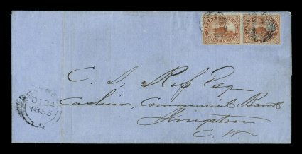 643 c 4d image#4d, 3p Orange red on thin paper, well margined horizontal pair, bright color on fresh paper tied to 1855 folded cover to Kingston by target cancels, "Montreal/L.C./DE 24 1855" double-arc c.d.s. at left, backstamped, a very fine and choice double rate usage; domestic double rate covers using the 3p value are rare, only 36 covers have been recorded with 3p (2x) franking, pairs are scarcer still; ex-Nickle, McLellan, Geldert and "Loch" Collection. (Image) Est. 500-750