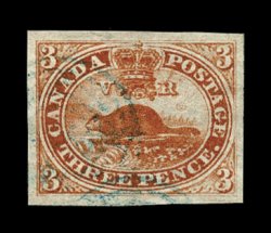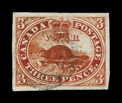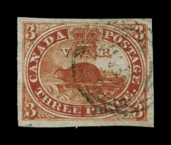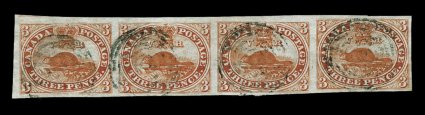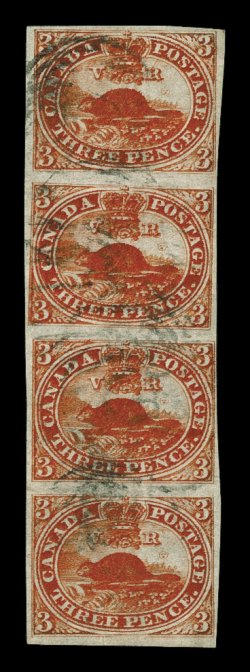 648 O Unitrade #4d, 4xii imageUnitrade #4d, 4xii, 3p Orange red on thin paper, major re-entry, position 61, pane B, the first stamp in a lovely and very rare horizontal strip of four, amazingly this strip has large to huge margins all around and is completely sound without the faults that so frequently plague larger multiples, the left re-entry variety has especially extravagant margins showing a small portion of the next stamp above, brilliant orange red color and clean sharp impression, each stamp with a light and unobtrusive target cancel, an extremely fine gem strip; this is the only major re-entry listed for plate B, it is most easily recognized by the doubling of the "3" at bottom left, plus there are extra lines in some of the letters of the inscription and doubling in other elements of the design, an exceptionally scarce re-entry and of great rarity in such a premium quality strip of four; 1974 BPA certificate; ex- E. Cary Fox, Reford and Carrington. (Image) Est. 3,000-4,000