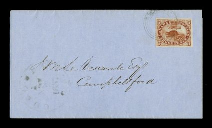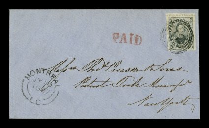 654 c 5 image#5, 6p Slate gray on medium wove paper, a spectacular quality cover featuring a superb 6p single franking despite a trivial facial rub, this remarkable stamp has extra large to huge margins including a portion of the top sheet selvage showing a large part of the "(Rawd)on, Wright, Hatch & Edison, New (York)." imprint, exceptionally attractive color and impression, tied to lovely blue envelope by numeral "21" cancel with beautifully struck "Montreal/L.C./JY 18 1857" double-arc c.d.s., to New York from the Prosser correspondence; an extremely fine cover perfect for exhibition; ex-Caspary. (Image) Est. 4,000-5,000