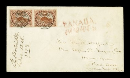 650 c Unitrade #4i, 4xii imageUnitrade #4i, 4xii, 3p Deep red on medium wove paper, major re-entry, position 61, pane B, the left stamp in a handsome horizontal pair (positions 61-62) with large generous margins all around, particularly the re-entry variety, also possessing deep intense color and an excellent impression that shows this scarce major re-entry well, tied to small lady's cover by two clear and neat strikes of black target cancel to 1853 cross-border cover to New York, manuscript Talbotville/Dec. 12th/1853 pmk., red "Canada/Paid 10Cts.", on the reverse is a London, U.C. transit where it crossed the border, extremely fine; not only a great example of this rare re-entry but an exceptionally attractive cover as well; 2001 BPA certificate. (Image) Est. 1,000-1,500
