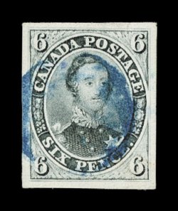 657 O 5b image#5b, 6p Greenish gray on medium wove paper, a sensational used single with vivid blue cancel, featuring lavish perfectly balanced margins, excellent color and impression, exceptionally fresh, extremely fine in all respects; a gem eye-catching single; signed H. Bloch (Unitrade C$1,500.00). (Image) $1,250.00