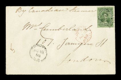 681 c 9 image#9, 7 1/2p Green on medium wove paper, attractive single with well clear to extra-large margins, especially bright green color and clean impression, tied to pristine 1859 cover to England by diamond grid cancel, small "Toronto/U.C./AU 19 59" single-arc c.d.s. at left, ms. "By Canadian Steamer" at top, posted to London with neat red "London/Paid/AU 31 59" receiving c.d.s. on the front, an extremely fine usage; uncommon with only 64 covers recorded to all destinations with 7 1/2p Green franking; excellent for exhibition with all markings on the face; ex-"Harbour" and "Loch" Collections. (Image) Est. 1,500-2,000