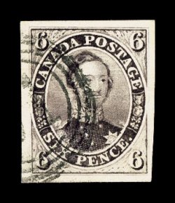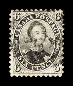 686 O 13 image#13, 6p Brown violet perforated 12, an exceptionally choice quality used single of this rare value exhibiting numerous impressive attributes that are frequently lacking on this perforated issue, including being well centered, far better than most extant copies, and surrounded by full even perforations that are almost never seen on this, fresh bright color and crisp impression, plus unobtrusively cancelled with numeral "21" four-ring cancel of Montreal, an extremely fine example this difficult stamp; 1959 PF and 2004 Greene Foundation certificates; ex-Engel. (Image) $4,500.00