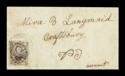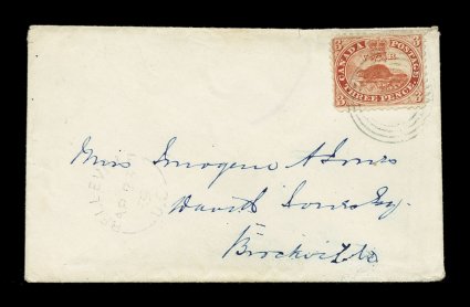 683 c 10 image#10, 6p Reddish purple on very thick soft paper, an extraordinarily choice example of this very rare stamp being a fault free single featuring four very large and exceptionally well balanced margins, bright fresh color and a strong impression, tied to a small and interesting cover to the United States by clear numeral "20 ringed cancel of Melbourne, U.C., on the reverse is a scarce double circle "Mon. & Isld. Pd Grand Tr'k R'way/No. 5/A/Down/May 21 1858" railroad cancel, posted to Craftsbury, Vermont, faint toning to cover, extremely fine; an especially desirable stamp in this outstanding quality and particularly on original cover; 2004 Greene Foundation certificate; ex-Luble. (Image) Est. 4,000-5,000