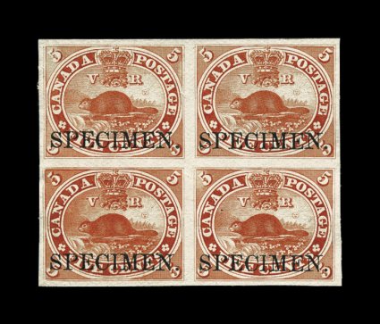 689 TCbl Unitrade #15TCiv imageUnitrade #15TCiv, 5c Brown red, trial color proof on India with horizontal black "Specimen." overprint, choice block of four, balanced wide margins all around, fresh bright color and detailed impression, extremely fine; catalog value for four singles. (Image) Unitrade C$1,000.00+