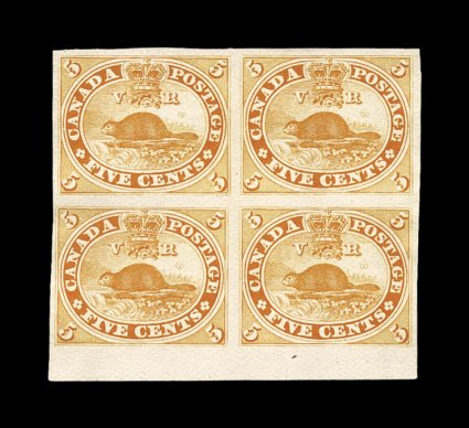 690 TCbl Unitrade #15TCvii imageUnitrade #15TCvii, 5c Orange yellow, trial color proof on India, bottom sheet-margin block of four, large to extra-large margins in addition to the sheet margin, exceptionally bright radiant color, extremely fine; catalog value for four singles. (Image) Unitrade C$1,100.00+