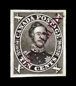692 P Unitrade #16Pii imageUnitrade #16Pii, 10c Black brown, trial color proof on India with diagonal carmine "Specimen." overprint, excellent color and impression, large even margins, trivial faint India thin, typical of these proofs, otherwise extremely fine and attractive. (Image) Unitrade C$600.00