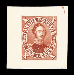 693 TC Unitrade #16TCiii imageUnitrade #16TCiii, 10c Brown trial color die proof on India from the compound die with the 12p "scar" die proof, on individual piece of India for this value measuring 24x31mm, on original card backing measuring 29x33mm showing die scratches at top right, beautiful clear color and razor sharp impression; extremely fine; very rare showpiece in this format and in our opinion quite undercataloged. (Image) Unitrade C$1,500.00