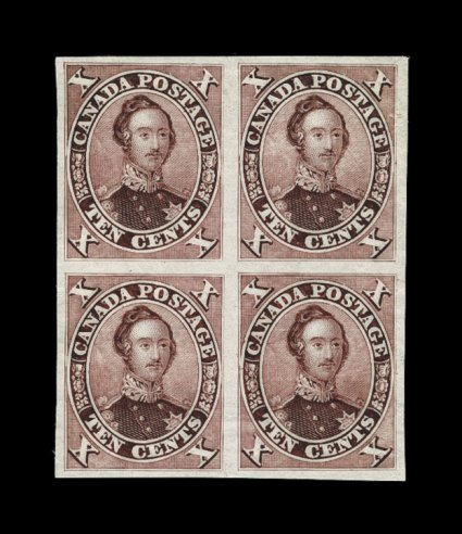 699 ogbl 17b image#17b, 10c Brown, perf. 11 3/4x11 3/4, an impressive mint block of four being overall unusually well centered for this issue, much better than the similar Dale-Lichtenstein block sold in the 2002 Carrington Sale by Matthew Bennett, fresh brownish purple color on bright white paper, excellent detailed impression with the top right stamp showing a short transfer at bottom, perhaps the same position as the red lilac example with short transfer, a solid intact block with full crisp perforations throughout, fresh full o.g., h.r., extremely fine; a highly select and exceedingly rare mint multiple of this classic issue; catalog values are for four singles; 2004 Greene Foundation certificate; ex-Pack, Jephcott, Nickle and "Midland" Collection (Unitrade C$7,500.00+). (Image) $3,200.00+