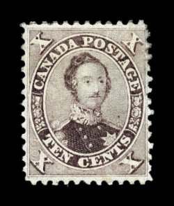 698 og 17b image#17b, 10c Brown, perf. 12x11 3/4, attractive mint single in a deep chocolate brown, in the Carrington sale this was attributed to the fifteenth printing order 15A, unusually well centered for this difficult issue, full o.g., h.r., extremely fine for this rare mint stamp; ex-Carrington (Unitrade C$1,875.00). (Image) $800.00
