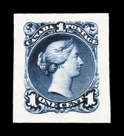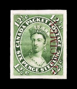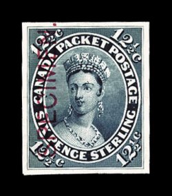 703 TC Unitrade #18TCii imageUnitrade #18TCii, 12 1/2c Blue, trial color proof on India with vertical carmine "Specimen.", Ty. A without serifs, fresh with deep blackish blue color, full wide even margins, extremely fine; only 50 examples known. (Image) Unitrade C$400.00