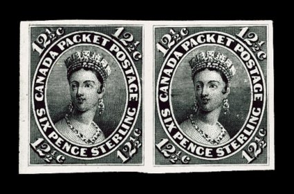 704 TC Unitrade #18TCix imageUnitrade #18TCix, 12 1/2c Black, trial color proof on India, horizontal pair, intense deep black color and crisp impression, large to extra-large margins, small India thin in left proof, otherwise extremely fine. (Image) Unitrade C$1,200.00+