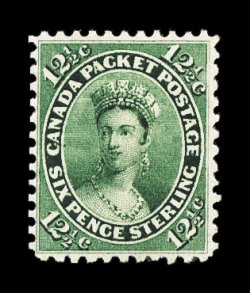 705 og Unitrade #18ii imageUnitrade #18ii, 12 1/2c Green, a spectacular quality mint example, in a condition that is almost never found on this issue, possessing marvelous centering amid extravagantly large margins so that none of the perforations impinge on the design in any way, plus its color could not be more intense and rich in the scarcer green shade (certificate specifying this shade variety), wonderfully fresh with full o.g., lightly hinged, extremely fine; a true condition rarity in this gem condition; 2002 Greene Foundation certificate (Scott for normal yellow green $750.00). (Image) Unitrade C$2,025.00