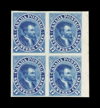 706 Pbl Unitrade #19P imageUnitrade #19P, 17c Blue, plate proof on India on original card, attractive right sheet-margin block of four, exceptionally bright color and detailed impression showing diagonal plate scratch at the top of the left stamp, nice even margins on the other three sides, extremely fine; catalog value is for four singles. (Image) Unitrade C$1,200.00+