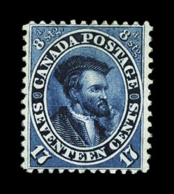 707 og 19 image#19, 17c Blue, perforated 12x11 3/4, a spectacular mint example in a condition that is next to impossible to find on any of the perforated 1859 issues due to their normally poor centering, the extraordinary copy offered here is not only perfectly centered top to bottom and side to side, but it also possesses an amazing overall mint "bloom" which stamps of this vintage rarely display, with the most intense color imaginable and an impression that would rival any proof, even its reverse is remarkable, sporting full clean o.g. that has been only very lightly hinged, an extremely fine gem for a world-class collection of Canada; signed several times by recognized experts and accompanied by a 1994 BPA certificate (Unitrade C$2,250.00). (Image) $825.00
