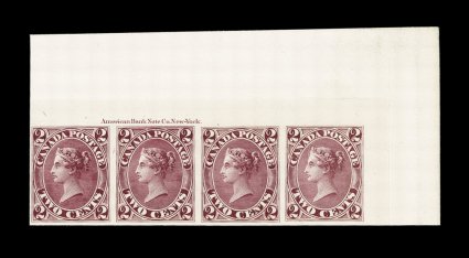 708 TC Unitrade #20TC imageUnitrade #20TC, 2c Dark rose trial color proof on India, top right corner margin "American Bank Note Co. New York" imprint strip of four, on original card with large sheet selvage, large even margins on the other two sides, very fresh with marvelously intense deep color, extremely fine; a very scarce inscription multiple; catalog value for four singles. (Image) Unitrade C$1,000.00