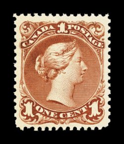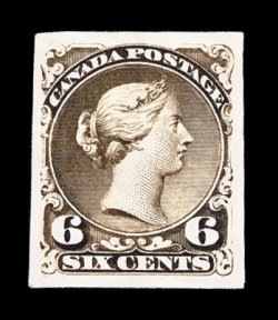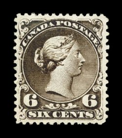 718 og 27 image#27, 6c Dark brown, a magnificent mint example of this truly rare stamp, possessing flawless centering amid large margins, eye-arresting and especially deep luxuriant color, perhaps a black brown as the accompanying certificate identifies this as #27i, an old Unitrade number for black brown that was changed to #27f, black brown on thin paper, this example is not on thin paper despite its deep color, which we believe to be just an intense dark brown shade, it also has a razor-sharp impression on bright paper, attractive full perforations, full o.g., relatively lightly hinged, extremely fine; a most remarkable stamp in this gem condition, 1999 Green Foundation certificate; (Unitrade for fine C$5,000.00). (Image) $1,500.00
