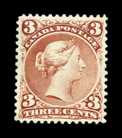 714 og 25 image#25, 3c Red, a superlative mint example of this always difficult stamp, being marvelously well centered amid large margins, totally unlike the vast majority of any of the Large Queen values, brilliantly fresh color and a crisp detailed impression, furthermore possessing incredibly full and even perforations, full clean original gum, very lightly hinged, extremely fine; actually a very rare stamp in this magnificent quality. (Unitrade C$4,000.00). (Image) $1,000.00