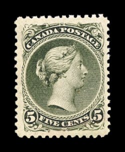 716 og 26 image#26, 5c Olive green, perf. 11 1/2x12, an extraordinarily choice mint single of this scarce and difficult Large Queen having features that few of this value possess, including being beautifully centered within immense uncharacteristically large margins, rich sumptuous color and clean razor-sharp impression, all surrounded by full even perforations, full, but light, hand-applied original gum being rather typical of this value, very lightly hinged, extremely fine; an exceedingly rare stamp in this gem original gum condition; photocopy of a 1985 Greene Foundation certificate for a block of four, this being the bottom left stamp (Unitrade C$4,000.00). (Image) $1,200.00