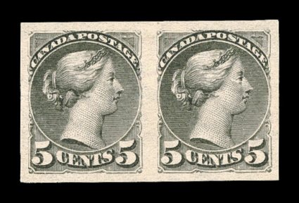 742 og 42a image#42a, 5c Gray imperforate, Q horizontal pair, large and beautiful balanced margins all around, fresh color and paper, full o.g., quite lightly hinged, extremely fine and choice; only 400 pairs of all shades of the imperforate issued (Unitrade C$900.00). (Image) $550.00