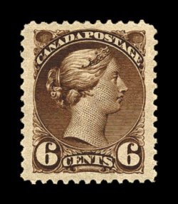 745 og Unitrade #43i imageUnitrade #43i, 6c Chestnut, brilliant mint single of this distinctive rich shade, precisely centered between large margins at top and bottom and huge wide margins at sides, wonderfully fresh, full o.g., lightly hinged, extremely fine (Scott for normal red brown shade $120.00). (Image) Unitrade C$175.00