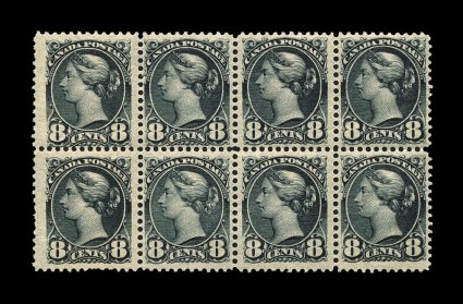 749 og/nhbl 44 image#44, 8c Violet black, exceptionally choice mint block of eight, fresh with rich color and full strong impression, overall very well centered, full o.g., lightly hinged in the two bottom row end stamps, rest are never hinged and includes several gem examples, some separated horizontal perforations, very fine-extremely fine (Unitrade C$4,490.00). (Image) $1,480.00+