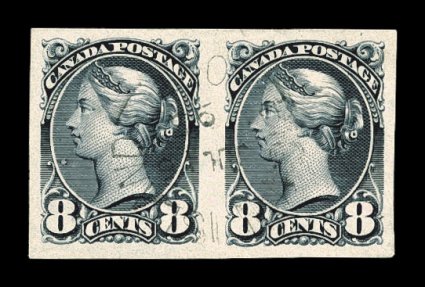 752 O 44i image#44i, 8c Violet black, imperforate, highly unusual used horizontal pair with light central strike of "Pelican Island/Ont." cds, large margins all around, fresh color on bright white paper, extremely fine; this shade was issued without gum and is probably the scarcer of the two colors; not priced used in either Scott or Unitrade. (Image) Est. 400-500