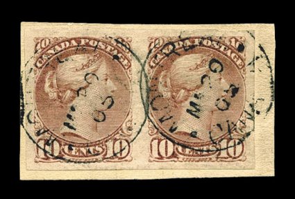 755 O 45c image#45c, 10c Brown red, imperforate, used horizontal pair tied to piece by Montreal March 20, 1905 c.d.s. postmarks, very large even margins all around, rich color, very fine; only a tiny number of used imperforates exist; unpriced used in Scott and Unitrade. (Image) Est. 400-500