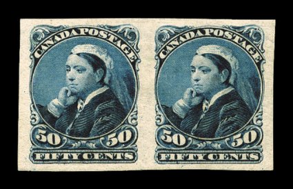 757 og 47a image#47a, 50c Deep blue, imperforate, horizontal pair, large even margins all around, deep intense color and impression on fresh white paper, o.g., extremely fine; this is the scarcest of the Small Queen imperforates with only 100 pairs issued (Unitrade C$1,500.00). (Image) $1,000.00