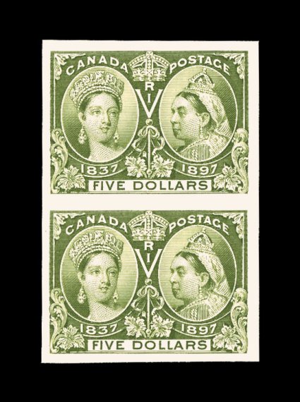 758 P Unitrade #50P-65P imageUnitrade #50P-65P, 1c-$5.00 Jubilees, plate proofs on card, highly select quality matched set of vertical pairs, being most appropriate for the horizontal format of the design, lavish margins, brilliant strong colors, plus the card is also pristine having never been mounted, extremely fine; gem sets are quite rare with as few as only 400 known of the $1.00 value. (imagea) (Image) Unitrade C$10,700.00