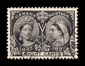 759 O 50, 54, 56, 57 image#50, 54, 56, 57, 1/2c, 5c, 8c and 10c Jubilees, four especially attractive appearing used values, each has select centering, bright colors and with light c.d.s. cancels, couple minor paper flaws including tiny thin speck in the 1/2c, extremely fine appearance C$410.00). (Image) $270.00