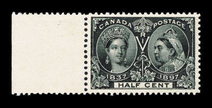 760 nh 50 image#50, 1/2c Jubilee, pristine left sheet-margin single, exceedingly well centered within large margins, striking deep intense "jet" black color on fresh white paper, o.g., never hinged, extremely fine (Unitrade C$450.00). (Image) $250.00