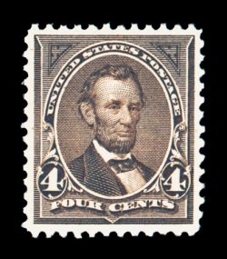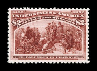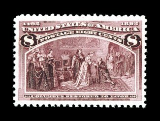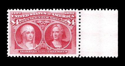 190 nh 244 image#244, $4.00 Columbian, handsome right sheet-margin mint single, incredibly fresh, with brilliantly rich color and a crisp impression on especially bright paper, well centered within large margins, immaculate o.g., n.h., very fine; never hinged examples of the Four Dollar Columbian, particularly certified and this fresh, are truly rare; 2000 PF certificate. (Image) $8,500.00