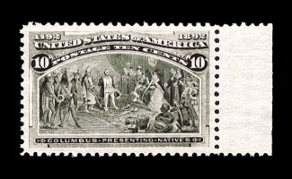 182 nh 237 image#237, 10c Columbian, a gem right sheet-margin mint single, possessing outstanding centering within extravagantly large margins which are most uncharacteristic, strong fresh color and a sharp impression, pristine o.g., n.h., extremely fine and handsome; 2001 PF certificate for a pair, this being the top stamp. (Image) $350.00