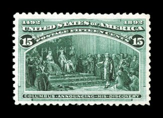 184 nh 238 image#238, 15c Columbian, exceptionally well centered within uncharacteristically large margins, deeply rich color and an excellent clarity of impression on fresh white paper, o.g., n.h., extremely fine and choice; 1998 PSE certificate. (Image) $750.00